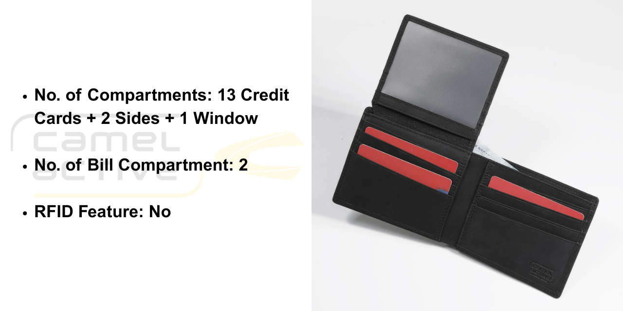 No. of Compartments: 13 Credit Cards + 2 Sides + 1 Window
