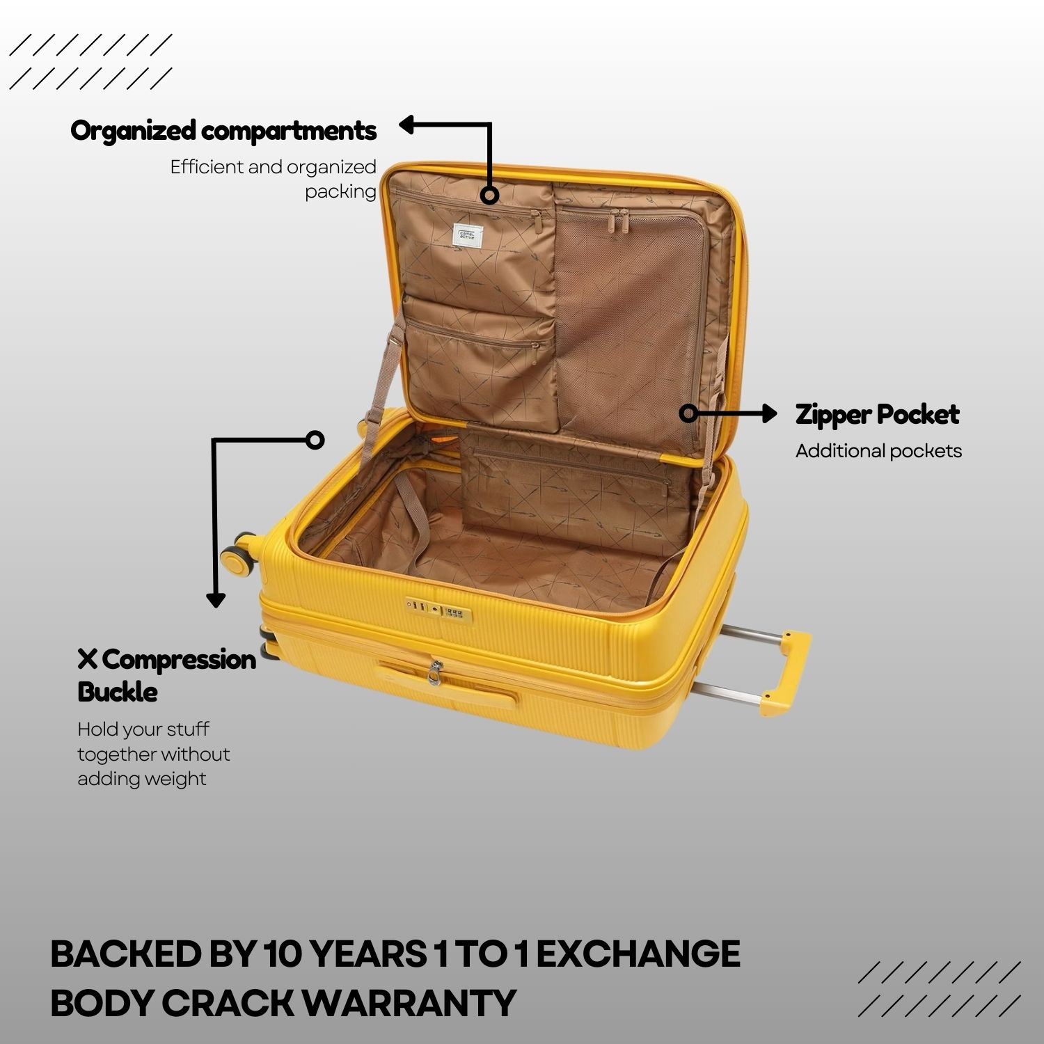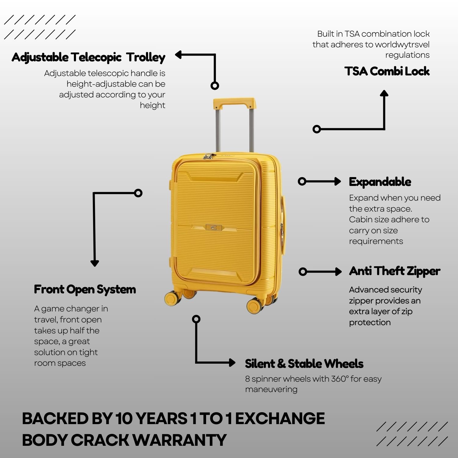Polypropylene (PP) material designed for durability and lightweight travel. Crafted from polypropylene, this luggage offers exceptional strength and flexibility, ensuring your belongings are well-protected.