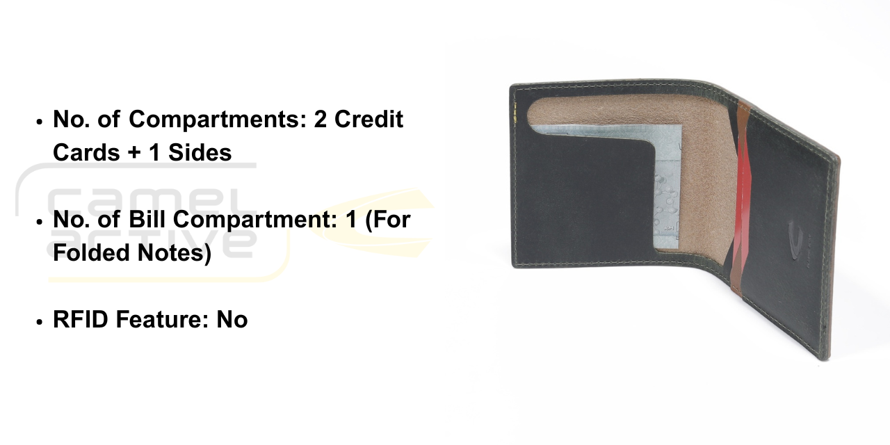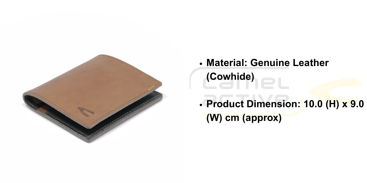 This bi fold leather wallet is made of genuine cowhide. Its dimension is approximately 10cm in height and 9cm in width. It has 2 credit cards compartments, a sides compartment and a bill compartment for folded notes. It does not has RFID feature.