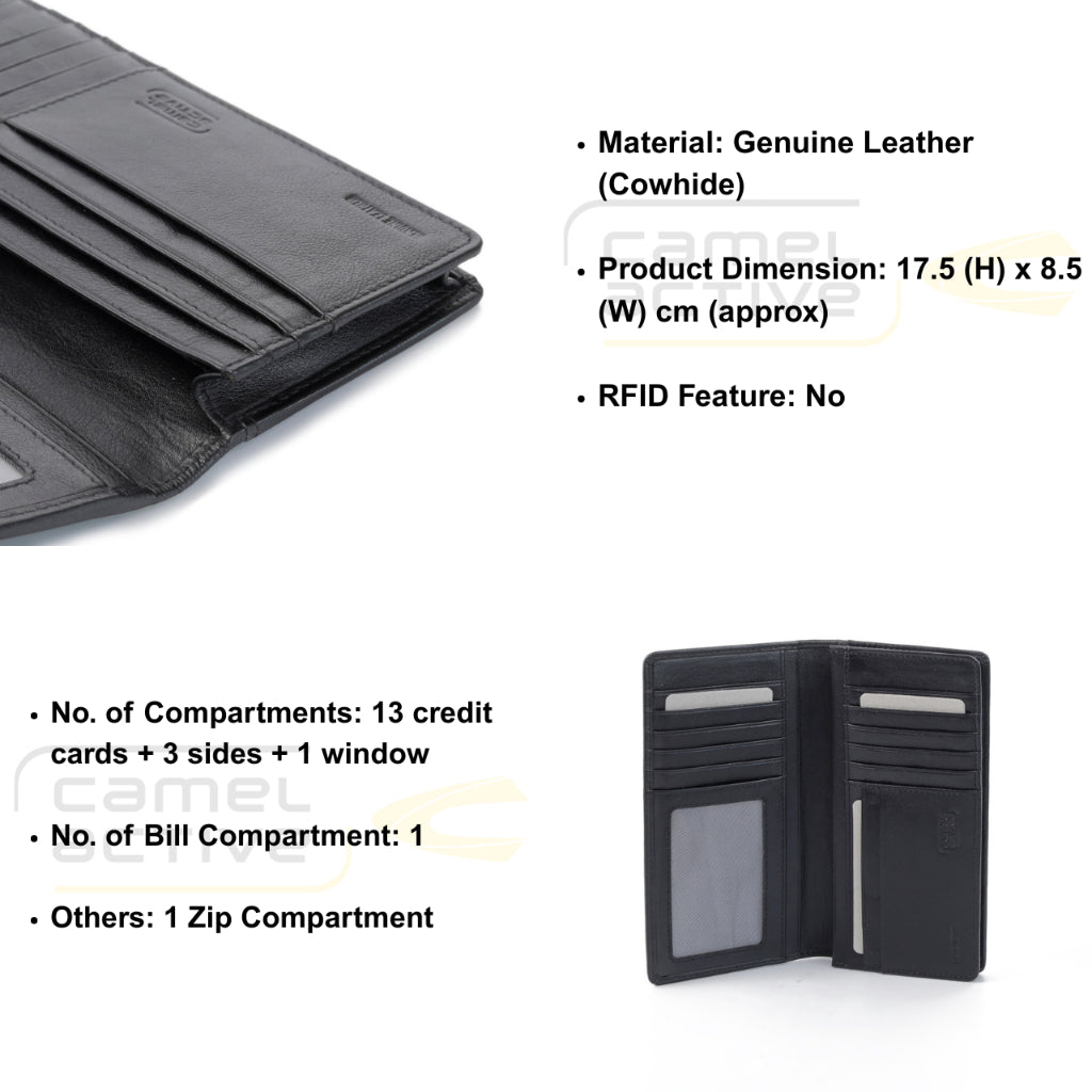 camel active Men Long Wallet Leather 13 Card Compartments Nappa Finished Black LW3B26WCN3#BLK
