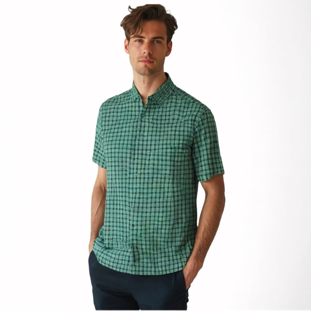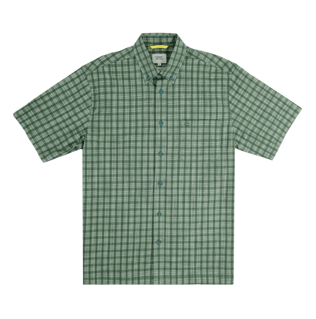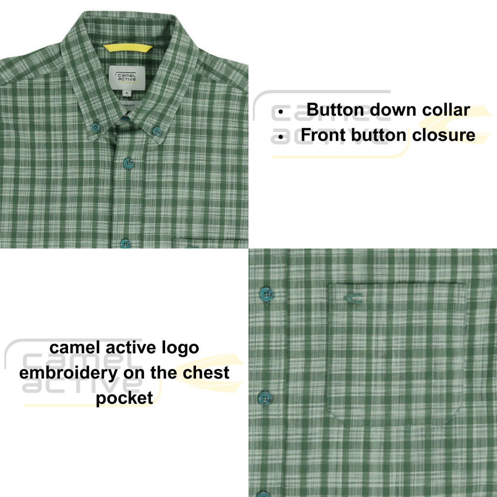 camel active Men's Regular Fit Short Sleeve Checkered Shirt 100% Cotton Spray Dye Green 9-102X26CHK1884