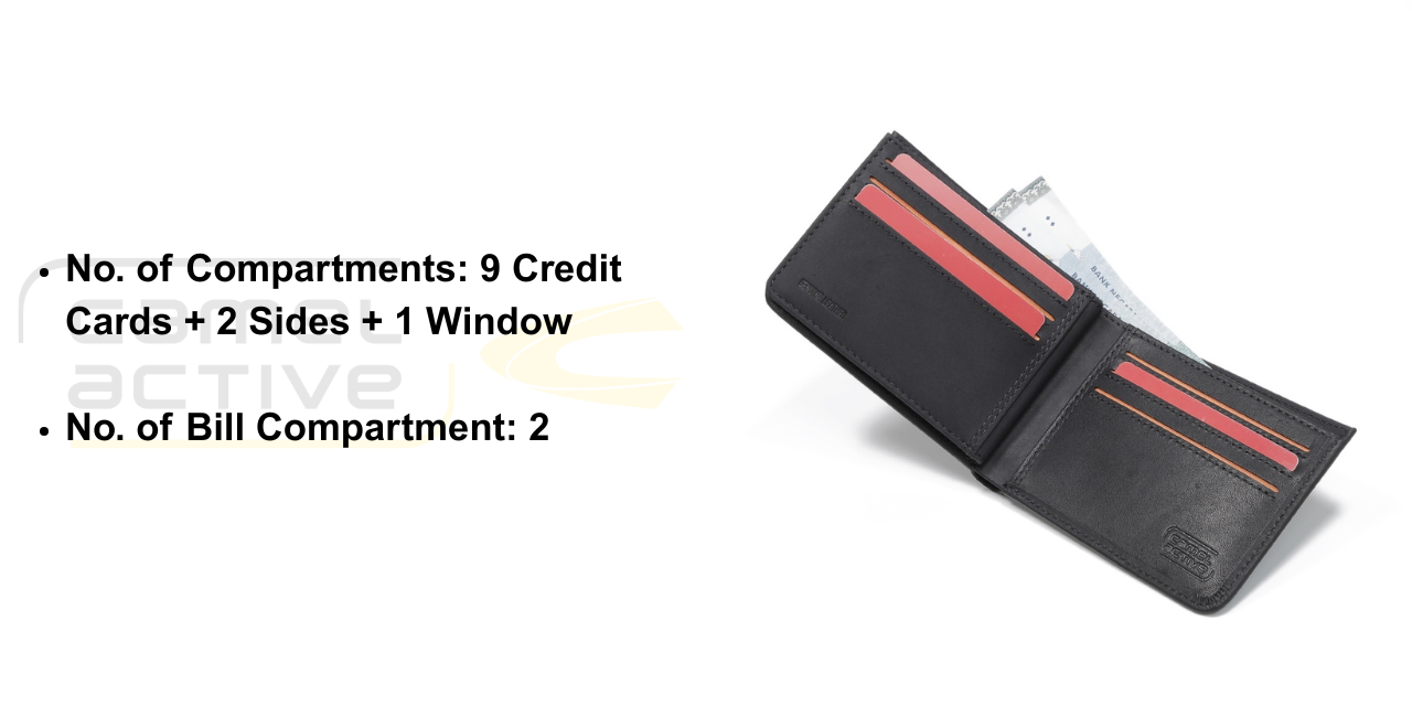 No. of Compartments: 9 Credit Cards + 2 Sides + 1 Window