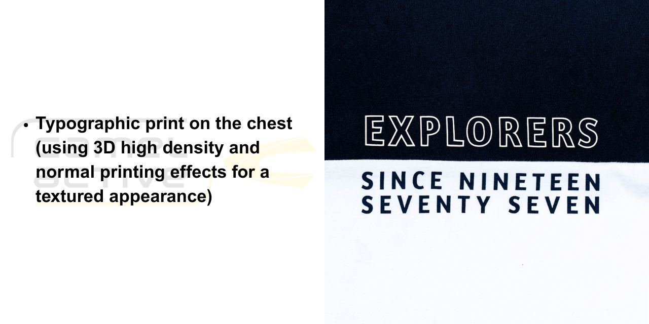 - Typographic print on the chest (using 3D high density and normal printing effects for a textured appearance)