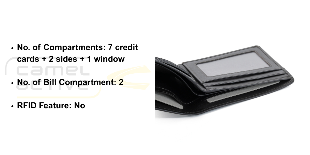 No. of Compartments: 7 credit cards + 2 sides + 1 window