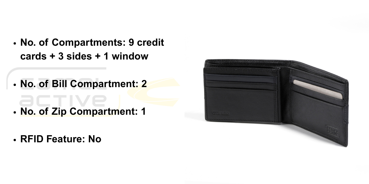 No. of Compartments: 9 credit cards + 3 sides + 1 window