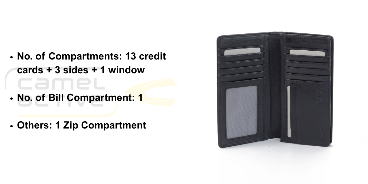 No. of Compartments: 13 credit cards + 3 sides + 1 window