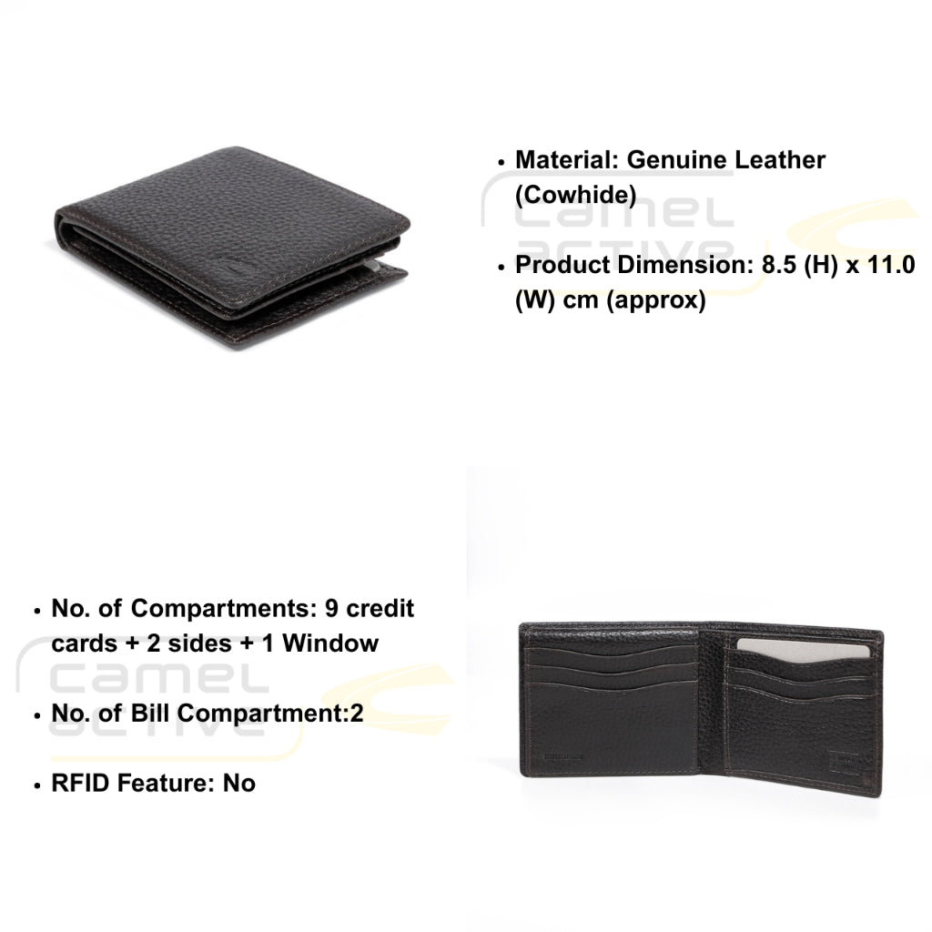 camel active Men Bi Fold Wallet Leather 9 Card Compartments Grainy Finished  Dark Brown UBF2615CO2#DBN