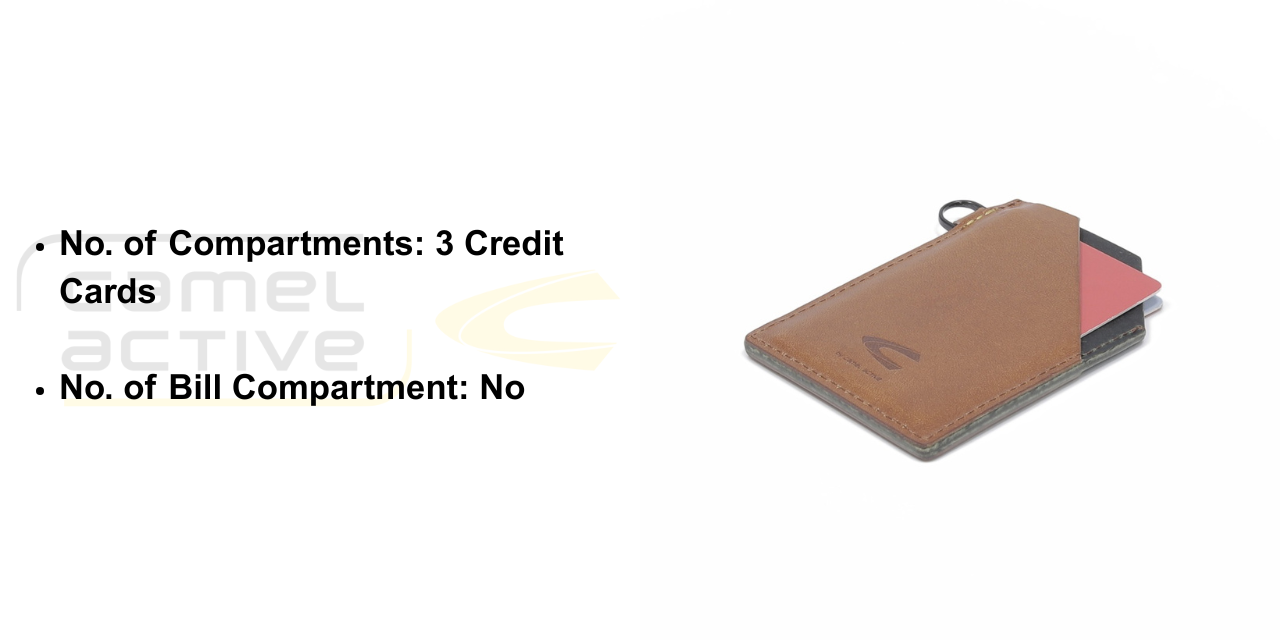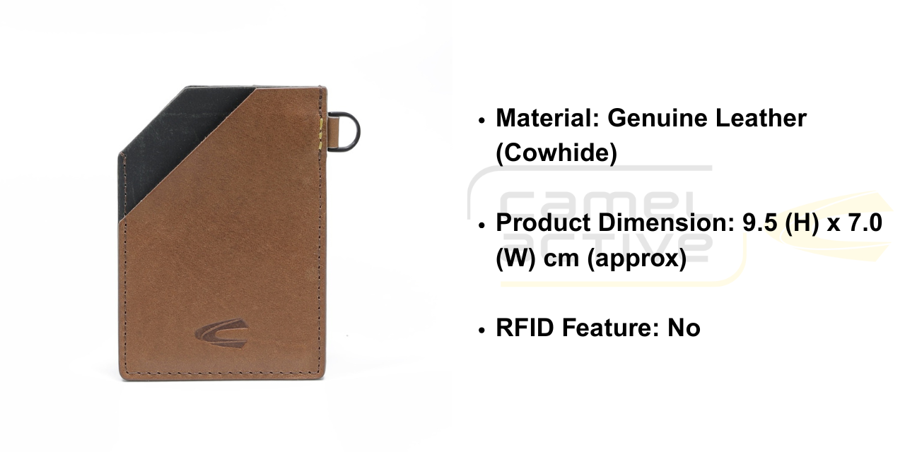 This card holder is made of genuine cowhide leather. Its dimension is approximately 9.5cm in height and 7.0cm in width. It has 3 credit cards compartments and no bill compartment. It does not has RFID feature.